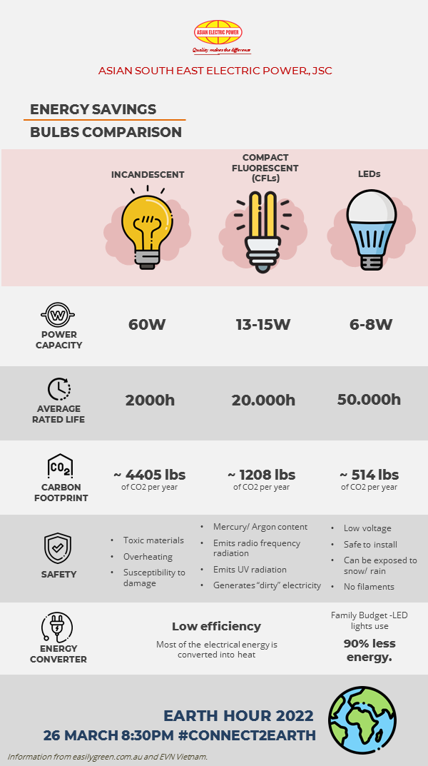 Let's find out which light bulb saves the most electricity through our Infographic below, and respond to the Earth Hour 2022.